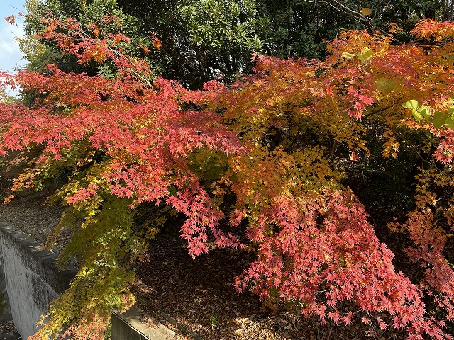 色づいたモミジ 先週、勤務先の外階段の脇に生えているモミジの色づきが悪いという話を書いたが、何のことはない、あれは単にまだ紅葉が本格的に始まっていなかったというだけのことだったようだ。今日見たらだいぶいい色になっていた。実は昨年は12月上旬に同じ木のことを話題にしており、結局このモミジは11月の終わりから12月の頭にかけてが紅葉シーズンらしい。昔に比べれば遅くなっていることは間違いない。